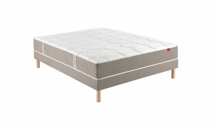 Un matelas avec matelas mousse alvéolaire avec 3 zones de confort. Avec un sommier en tissu gris.
